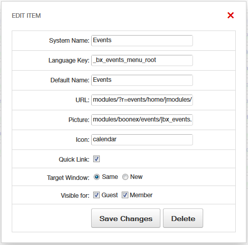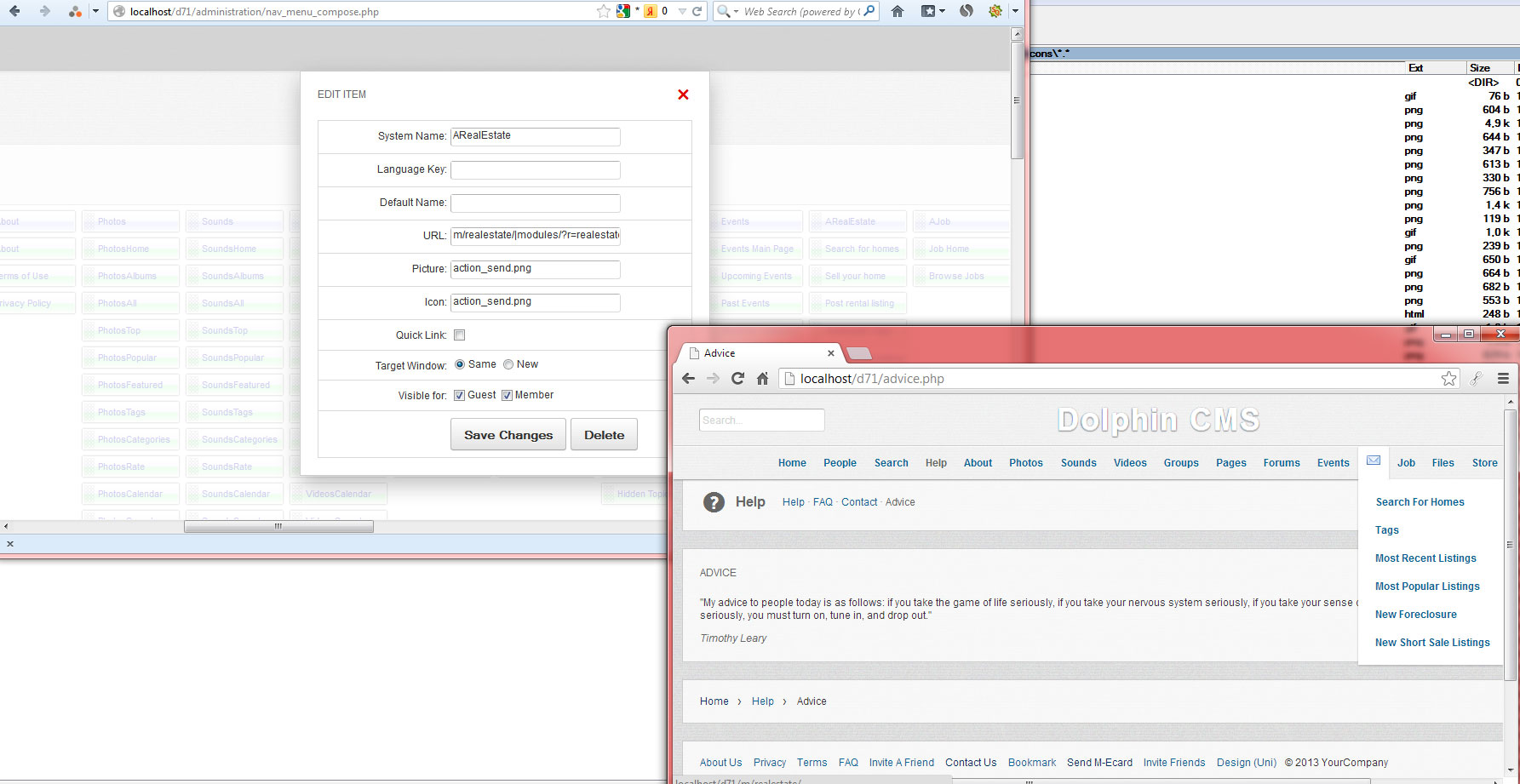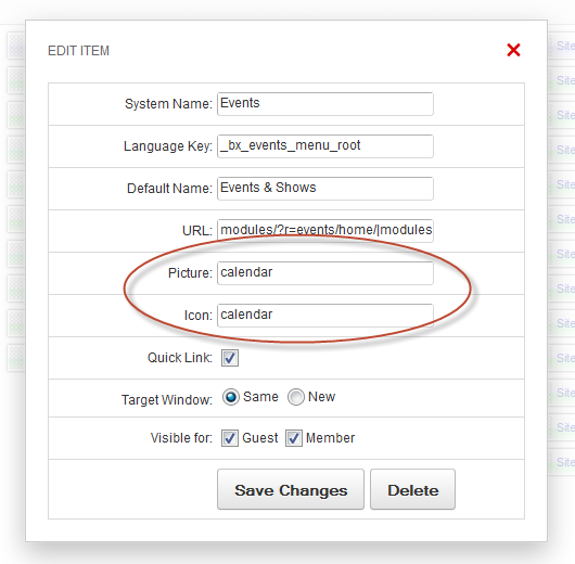 For Dolphin 7.2.x there's a workaround for the navigation menu icons. You will need to add the icon in the language string but you will also need to delete the Picture value in the builders. For example, yoiu want to add an icon to the Home item on the Navigation bar. You will need to edit this value in Settings -> Language Settings. <i class="sys-icon home"></i> Home The word home in this string is exactly the name of the icon (which you noticed in the Picture field before). Now you will need to remove the value for the Picture field because otherwise the Quick Links section will show two home icons for this menu item.
