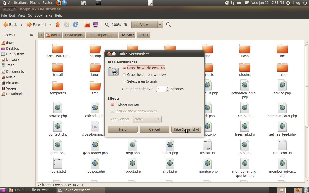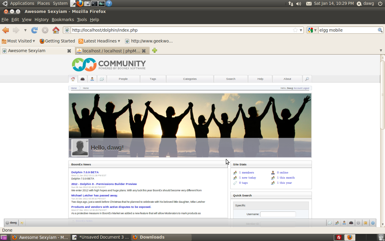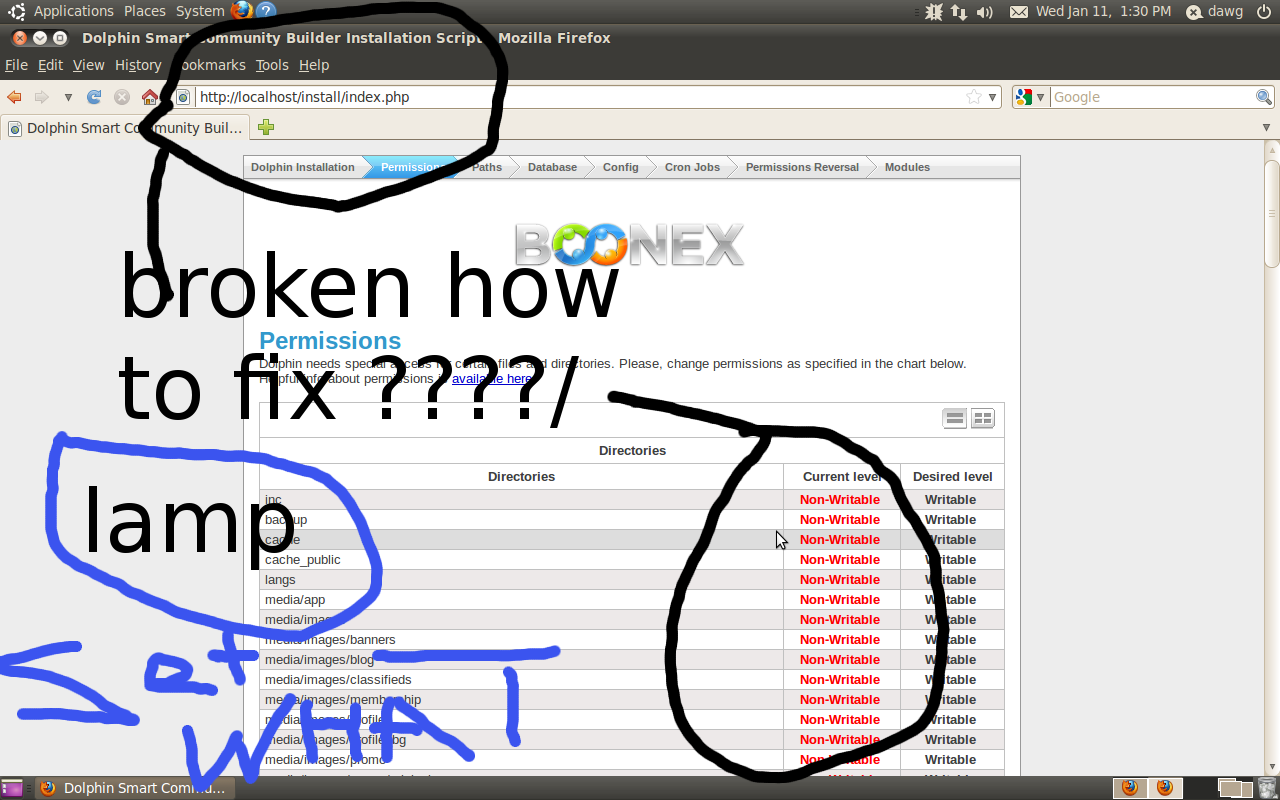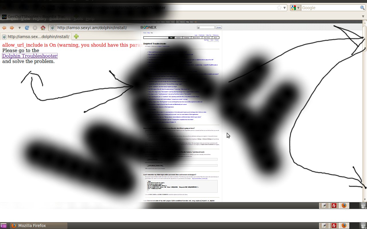 install sucessfull topo: frest install ubuntu 10.04 w standard updates. LAMP install ....moved website to /home/public_html...(so i can access it easy) install filezillla to set permissions. NO GO. refused to set permissions. FIX installed ftp server and configed it like it says here http://www.cyberciti.biz/faq/ubuntu-vsftpd-ftp-service-server/ nd ran the ftp server ... then..ftpzilla.....highlighted dolphin folder/director r click properties..set permissions...selectlall 777 and checked all directiries and files... hit ok.. it did it. Yeah.... |