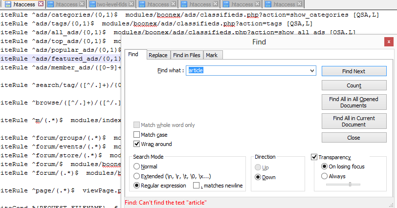 hi...i opened .htaccess in notepad++ ...but i find blog but not article...any other .htaccess to look for article..??