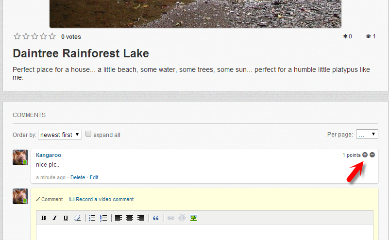 hi..i made a comment on a photo and i was able to like my own comment ..how to stop this.. also how to add upload photo option in WYSIWYG editor in comments: |