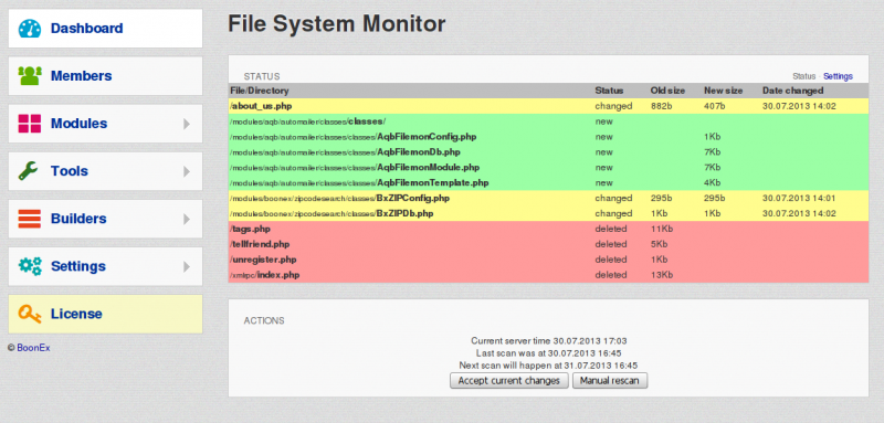 Easy to install and easy to use. With the color coding, you have at a glance an overview of changes made, then can get the specifics on each file; including the file path, text description of the status (new, changed, or deleted), the old and/or new file size, and the date the change occurred. Very helpful admin tool!