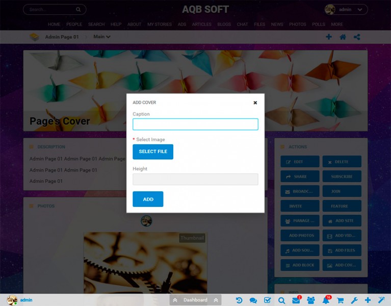 Create cover for a page by clicking "Add Cover" button on the page and filling in the form. See images #1 and #2. Cover can be created with and without caption.