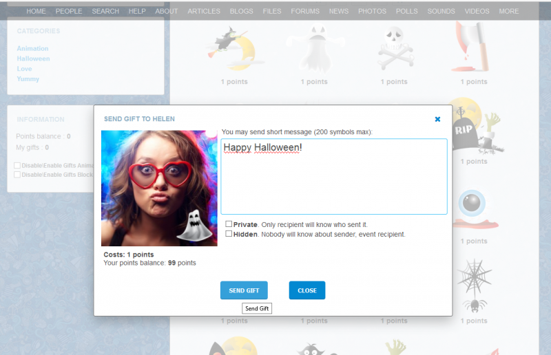 This module allows members to send virtual gifts to their friends or other members on Birthday, Halloween, Christmas and etc.. It has simple design and may be very effective on your site, because allows members to flirt with someone, praise or congrats and etc. Gifts may be free or require to pay with points(if you have our Global Points System) for them, thus it is additional ability to monetize your site.